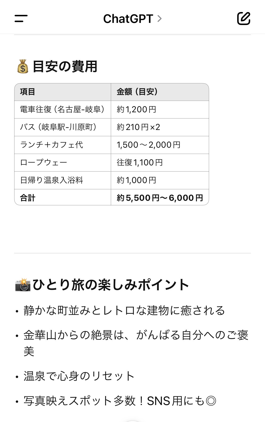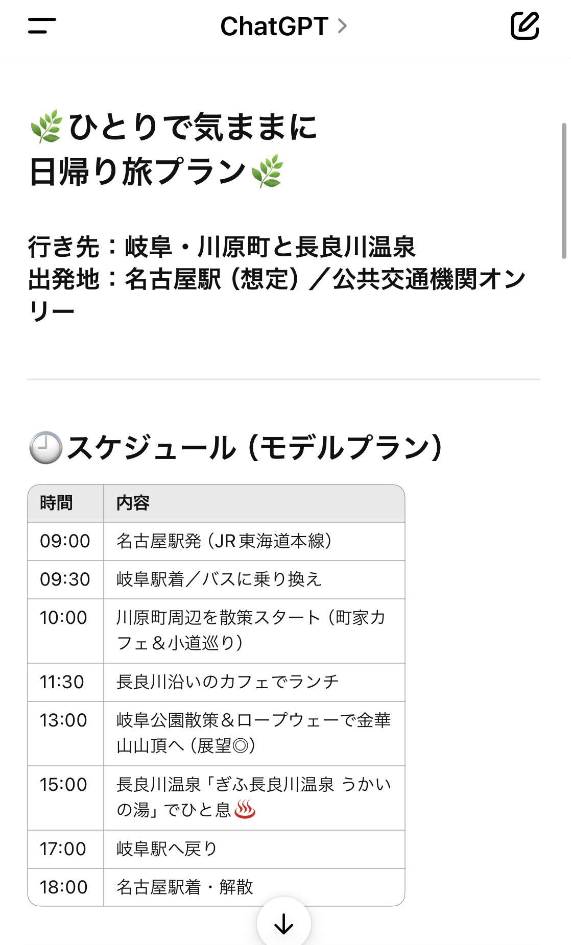行き先は川原町と長良川温泉。ええじゃないですのん。もしや「仕事が忙しい」って書いたから、チャッピーさん(※Chat GPT様の愛称。今名付けた)気を使ってくれたのか?