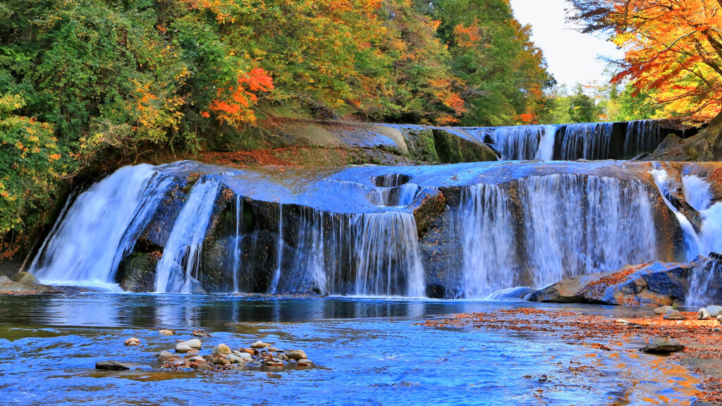 山形県と福島県に境を接する宮城県は山あいの町・七ヶ宿(七ヶ宿)の道の駅には、雪室を利用したブランド米や七ヶ宿ダムをモチーフにした「ダム湖カレー」が人気を集め、ほとばしる滑津大滝や美しい山並みに囲まれた至福のひとときが堪能できるスポット。