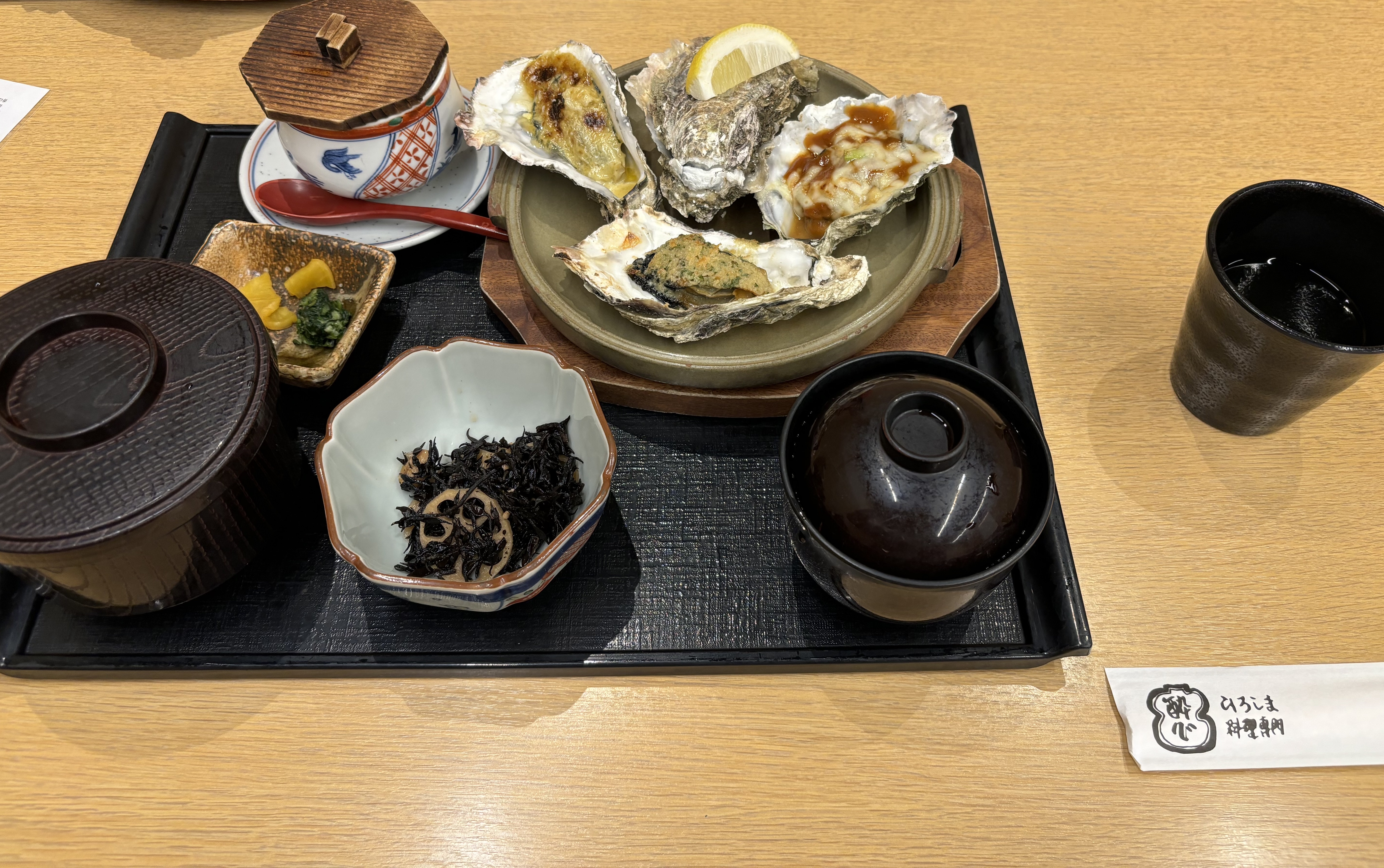 駅前で牡蠣料理の専門店に入った。広島湾での牡蠣漁はなんと16世紀にまでその歴史をさかのぼるらしい。味はもちろん美味だった。